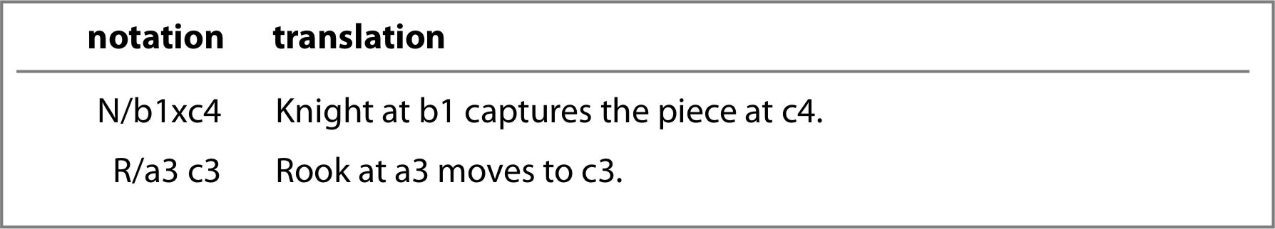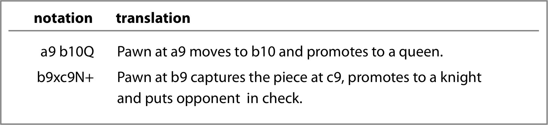 Which Knight or Rook Is Moving or Capturing?When both of a player's rooks or knights can move to the same location, you must identify which rook or knight is moving by following the letter-symbol of the moving piece with a foreslash "/" followed by its location, as in "R/a10 a8" which means the rook at a10 moves to a8. (See below for other examples.)