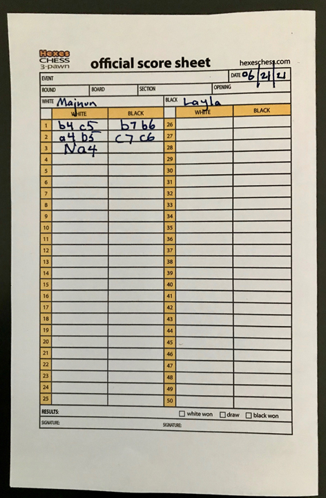 Recording a MatchTo record a chess match, use a Hexes Chess score sheet. Below is a record of the first five moves of a match between Majnun and Layla.